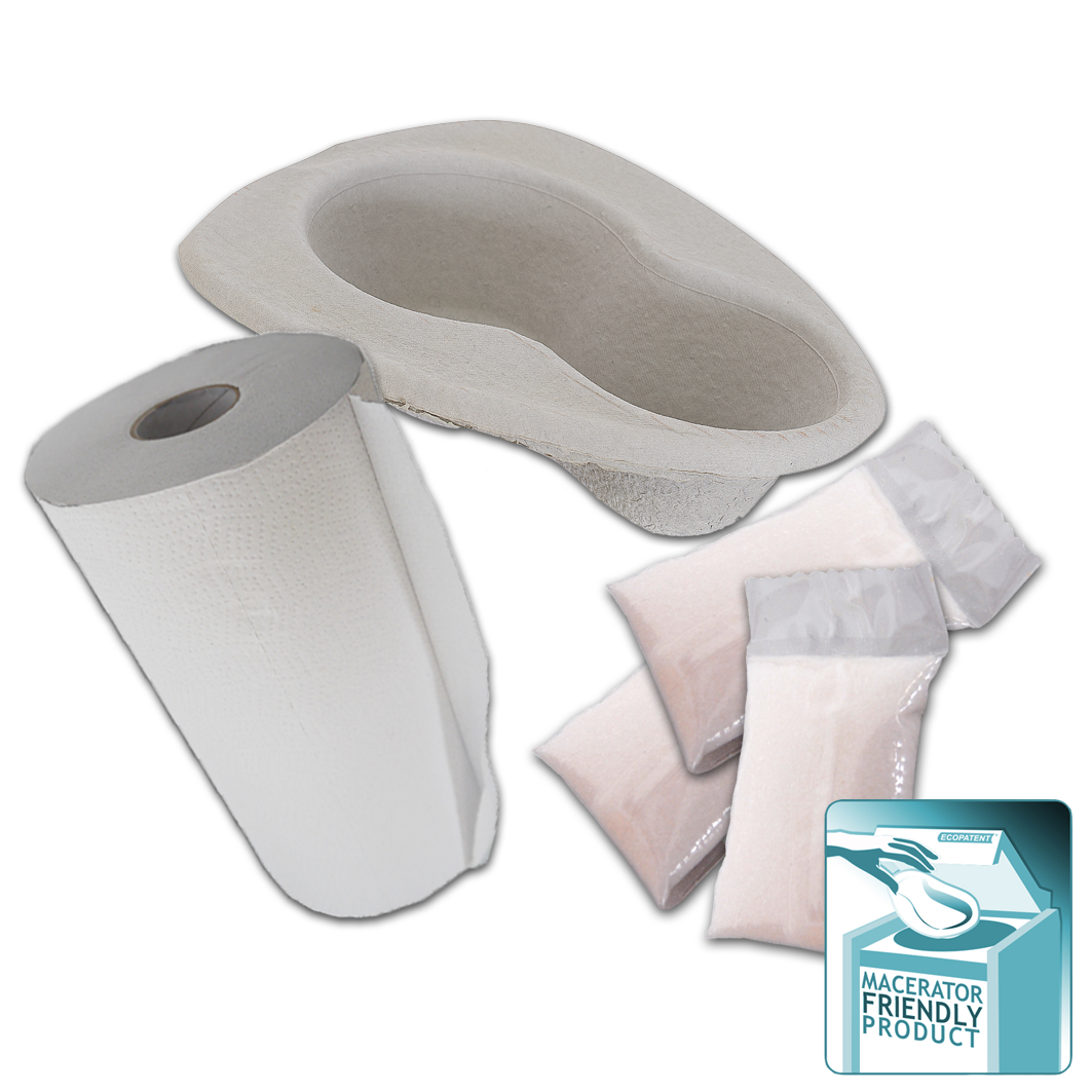 - Bettpfanne Grau EC69439 (80 Stück)- Deckel Grau Zellstoff EC69439 (80 Stück)- Super Absorb 6g (80 Stück)- Toilettenpapier doppelbreit (1 Rolle)- Universalkarton als Regalsystem und Entnahmebox nutzbar